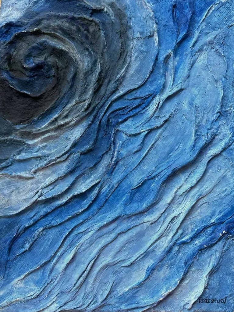 This abstract painting constructs the spiritual core of the ocean with a pure blue color palette. In the picture, different shades of blue spread out through rhythmic folds and vortex-like textures. It abandons the concrete form of ocean waves, yet enables viewers to perceive the dynamic motion and power of surging waves. The vortex on the left is like an abstract representation of deep-sea eddies, concentrating the visual focus as if it were a convergence point of the ocean’s internal energy. Through the gradient of blue and the layers of textures, the creator conveys thoughts on the “flow” and “unknown” of the ocean, evoking people’s reverie about the vastness, mystery and immense power contained in the ocean. In the interweaving of colors and forms, it triggers an abstract resonance about the rhythm of nature and life.
